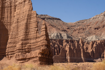 The next day we decided to spend the day driving the off-road to Cathedral Valley. We knew we wouldn't be able to forge the river, with our small car, on the loop so we decided to just start off Hwy 24 and drive as far as we could and then turn around. You start by driving through some wide open drier areas with cool formations and just amazing colors throughout the layers of rock the further you go in.
