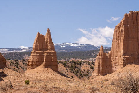 Then you reach a junction where you continue on the Cathedral Valley loop and begin to enter the part where there are lots of monoliths. You begin to see the snow capped mountains in the background which are an amazing contrast to the dry red desert colors.