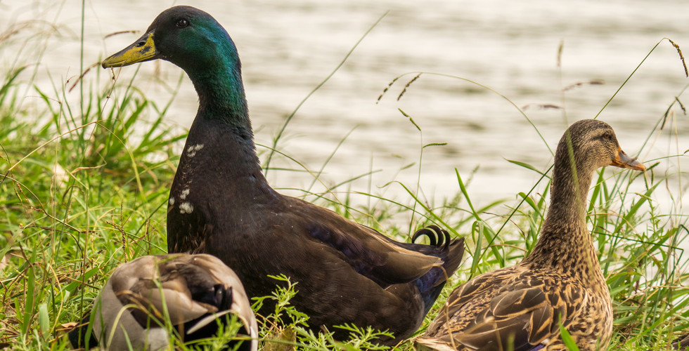 The Mallard duck is quite large as well, especially the male with its brilliant green head and yellow bill. The females are mottled brown and have orange-and-brown bills.