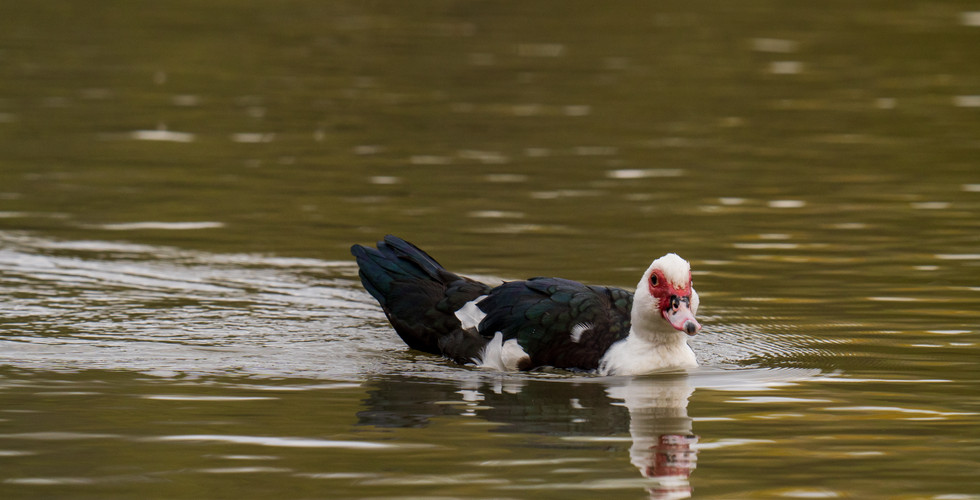 The Moscovy duck is very interesting and often has red facial skin with odd warty growths. It kind of reminds me of a turkey face. The ones I've seen are quite large and sometimes fairly tame as I had one come sit right by me on the ground as I was taking pictures.