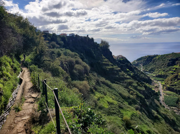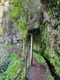 Right away we started following the levada which is an irrigation canal that brings water down from the mountain into these terraces. There are lots of them all over the island and they are very popular hiking routes.t was incredible to walk on the narrow path next to the levada. Sometimes there were posts connecting cables that provided some safety and other times nothing at all! On some sections we could walk and look around at the same time. During other parts we had to concentrate on where we were walking since there was nothing at all to keep us from falling off! The views into the canyon were just stunning and the lighting kept changing as the clouds rolled around which even created a beautiful rainbow at one point.