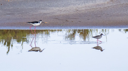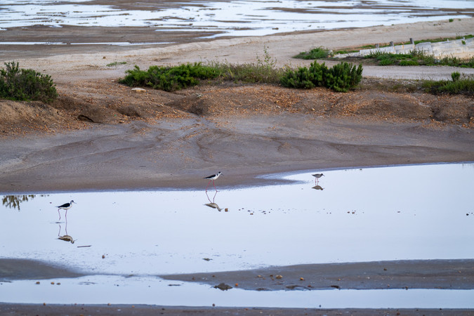 Wading Black-winged Stilts with their thin, straight bill and long bright pink legs.