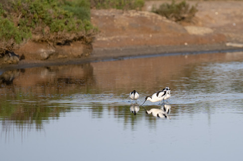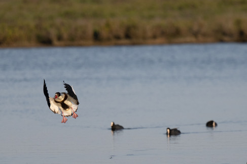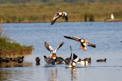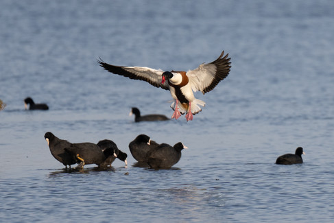Common Shelducks which are a large gooselike duck with bright red bills and wonderful colors. They were mixed in with Eurasian Coots and the Avocets.